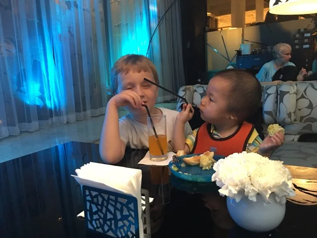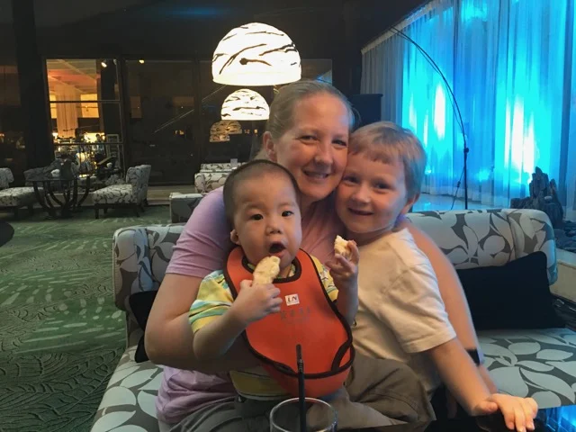 I started this post with a video to show you the glamorous side of things. How much we get wined and dined as adoptive families sitting in a gorgeous lounge inside from a 38-foot manmade waterfall. It's our little respite in the middle of a highly populated city filled with honking taxis, confusing traffic patterns, and bicyclists 2nd to craziness only to the Netherlands. It is quite the life I tell ya. To be honest we've had a great stay in Guangzhou and were quite tickled to be invited to the reception, they even had mini-hotdogs and chicken wings.